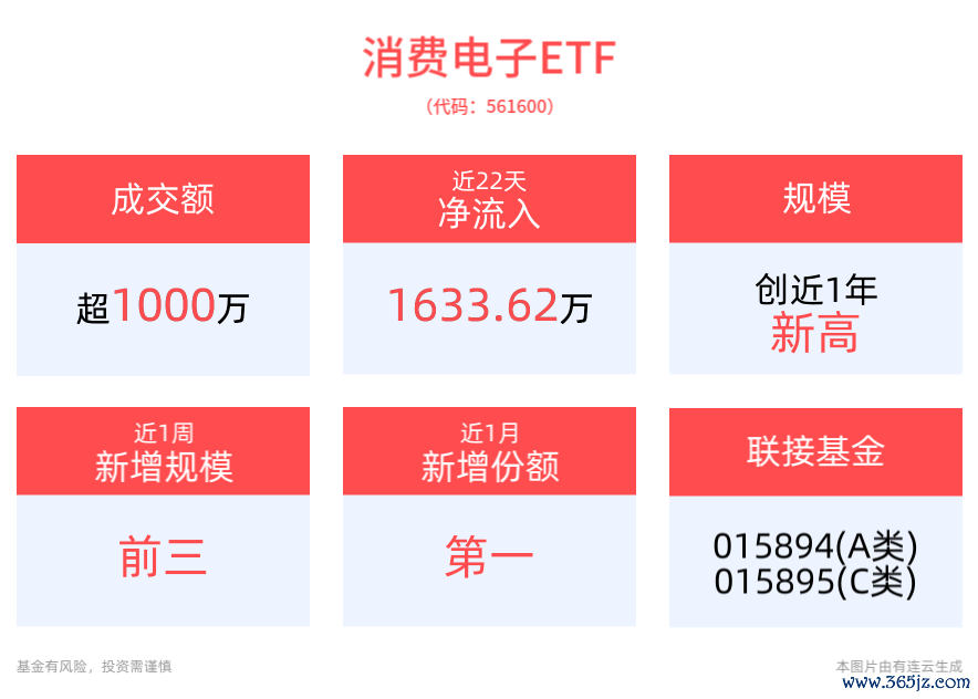 资金流入方面,消费电子ETF最新资金净流入596.75万元。拉长时间看,近22个交易日内,合计“吸金”1633.62万元。